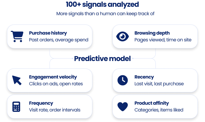 Yespo CDP използва машинно обучение, за да оцени всеки клиент по това колко вероятно е да закупи и ги групира в ясни сегменти. Използвайте тези високо качествени сегменти във вашите SMS и месинджър кампании, за да не харчите бюджет за контакти с ниско намерение.